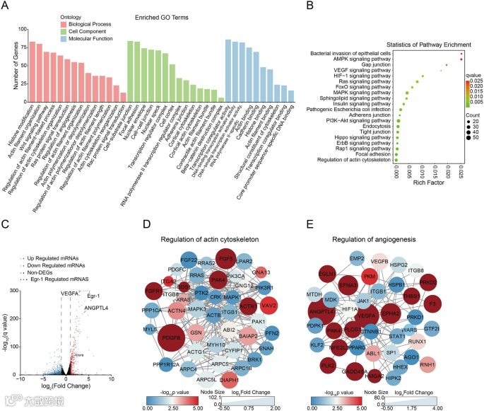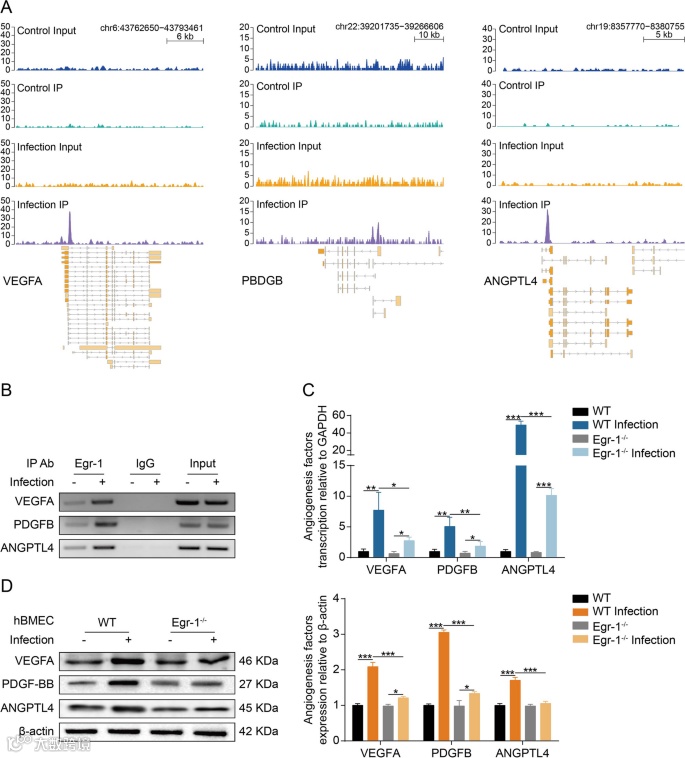 生物信息学分析表明,Egr-1通过其潜在靶基因VEGFA、PDGFB和ANGPTL4调节 actin细胞骨架和血管生成。ChIP-seq数据显示,感染组中VEGFA、PDGFB和ANGPTL4的启动子区域存在显著的Egr-1结合峰,而对照组几乎没有结合峰(Fig 5A)。因此,研究者假设VEGFA、PDGFB和ANGPTL4可能是脑膜炎型大肠杆菌感染hBMEC的Egr-1的潜在靶基因。随后,研究者进行了ChIP-PCR实验,结果显示,细菌处理后的hBMEC中Egr-1与VEGFA、PDGFB和ANGPTL4启动子的结合显著增加(Fig 5B)。此外,RT-PCR和Western blot显示,Egr-1敲除在感染的hBMEC中部分抑制了VEGFA、PDGFB和ANGPTL4的转录和表达水平(Fig 5C和5D)。这些结果共同表明,Egr-1激活对于脑膜大肠杆菌感染的hBMEC中VEGFA、PDGFB和ANGPTL4的上调是必需的。