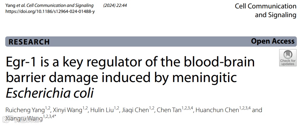 2024年1月17日华中农业大学动科动医学院陈焕春院士、王湘如教授团队在期刊Cell Communication and Signaling(IF:8.4)发表了题为“Egr-1 is a key regulator of the blood-brainbarrier damage induced by meningitic Escherichia coli”的研究论文。该研究结果表明Egr-1依赖性机制是脑膜炎型大肠杆菌破坏血脑屏障的途径,为细菌性脑膜炎的治疗提供了有希望的靶点。爱基百客为该研究提供ChIP-seq技术支持。