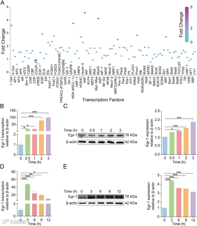 为了研究脑膜炎病原体诱导的转录因子模式,研究者对人脑微血管内皮细胞(hBMEC)进行了3小时的感染,结果发现热休克因子(HSF)、肌原调节因子(MYOD)、母体效应蛋白(HEN)、Octamer结合蛋白1(OCT1)和早期生长反应蛋白1(Egr-1)的活性显著增加。在hBMEC感染脑膜炎病原体后,Egr-1的mRNA转录和蛋白水平显著增加。此外,在感染小鼠脑微血管中,Egr-1的转录水平显著上调,蛋白水平也显著增加。这些结果表明,脑膜炎病原体大肠杆菌感染可以显著激活hBMEC中的Egr-1(Fig 1)。