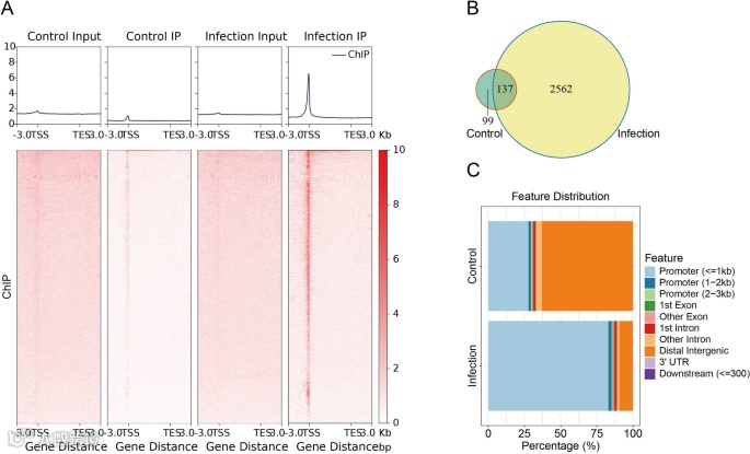 研究者通过ChIP-seq实验发现在脑膜炎型大肠杆菌感染的人脑微血管内皮细胞(hBMEC)中,Egr-1在细菌诱导的基因组开放位点有明显的富集,表明这些位点受Egr-1调控。统计分析显示,与对照组相比,细菌感染的hBMEC中的可接近峰数量显著增加。在这些peak峰中,感染组和对照组分别有2,562个和99个独特的峰,同时还有137个重叠的峰。进一步利用HOMER分析可接近区域的基因组功能元件,结果显示,感染组中超过80%的峰主要富集在启动子区域,而对照组中的大多数峰富集在远端间基因区域。这些发现表明,Egr-1是脑膜炎型大肠杆菌诱导的血脑屏障功能障碍的主要转录调节因子(Fig 2)。
