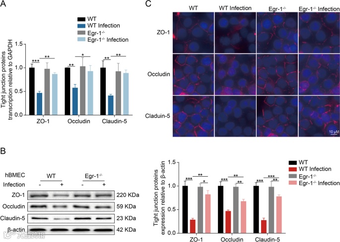 Fig 6.hBMEC中的Egr-1敲除可抑制脑膜炎型大肠杆菌诱导的 TJ 蛋白降解