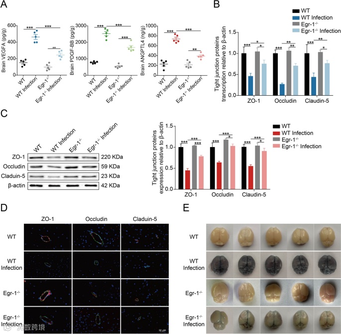 Fig 7.小鼠中Egr-1敲除可抑制脑膜炎型大肠杆菌诱导的BBB破坏