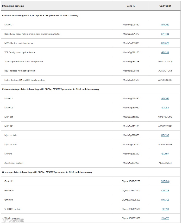 在Y1H文库筛选(1181 bp)和DNA pulldown(382 bp)中鉴定出的NCR169启动子区相互作用的蛋白质