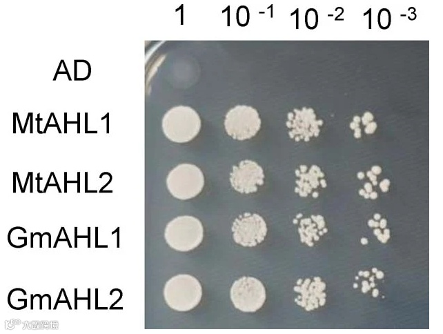 酵母单杂交(Y1H)检测NCR169 1181bp启动子区域与MtAHL 1、MtAHL2、GmAHL1或GmAHL2的结合