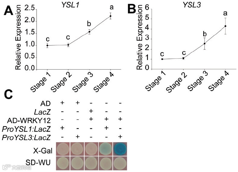 YSL1和YSL3在叶子、花粉和发育中的种子中运输金属-尼古丁胺(NA)复合物,并在调节种子发育和成熟阶段的铁(Fe)积累中起重要作用。然而,它们的基因转录水平如何调节尚不清楚。在这项研究中,研究者使用酵母单杂交筛选鉴定出转录因子WRKY12,它在拟南芥中直接调节YSL1和YSL3基因的转录水平。WRKY12与YSL1和YSL3具有相反的表达模式,wrky12突变体对Fe缺乏具有耐受性,而WRKY12过表达系对Fe缺乏敏感。在种子发育和成熟过程中,WRKY12可以直接结合YSL1和YSL3的启动子并抑制它们的表达。遗传分析表明,WRKY12在种子发育和成熟阶段的Fe摄入中位于YSL1和YSL3的上游。总之,该研究的结果表明,WRKY12通过抑制YSL1和YSL3的表达,负调控植物种子中的铁摄入。