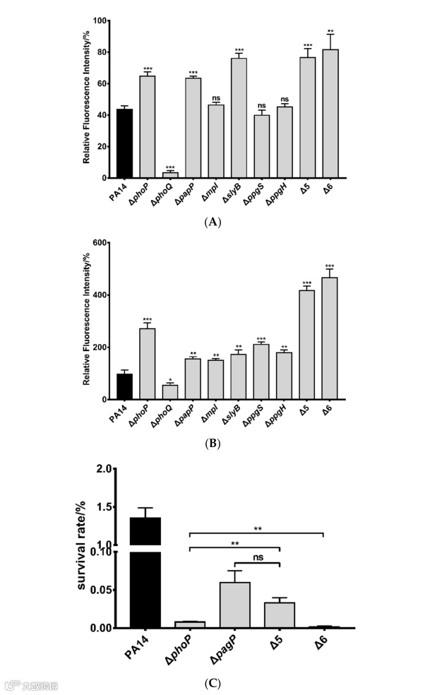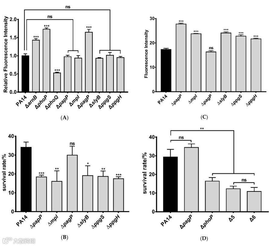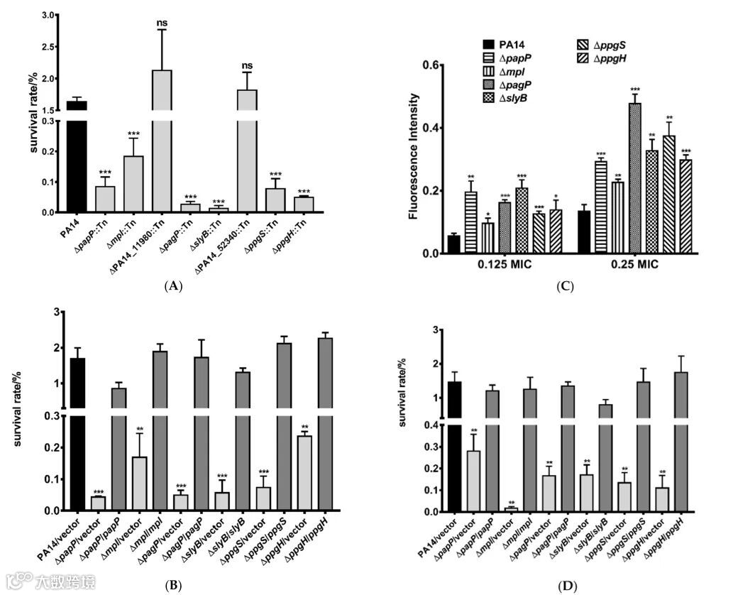 为了研究PhoP-PhoQ调控基因在细菌对多粘菌素B耐药中的作用,作者从PA14转座子插入文库中选择了突变菌株,然后作者检测了它们在细菌对多粘菌素B耐受性中的作用。结果显示,papP::Tn、mpl::Tn、pagP::Tn、slb::Tn、ppgS::Tn和ppgH::Tn的存活率低于野生型PA14,而PA14_11980::Tn和PA14_52340::Tn的存活率与野生型PA14相似(图3A)。为了进一步确认这些基因在细菌对多粘菌素B耐受性中的作用,作者在野生型PA14中构建了缺失突变体。结果表明,缺失PA14_11960 (papP)、PA14_11970 (mpl)、PA14_46900 (pagP)、PA14_50740 (slyb)、PA14_52350 (ppgS)和PA14_52370 (ppgH)会降低多粘菌素B处理后的细菌存活率 (图3B)。此外,多粘菌素B处理导致突变体中更多的溴化乙锭(EtBr)流入,导致更严重的膜损伤(图3C)。papP、mpl、pagP、slyb、ppgS和ppgH的缺失也增加了细菌对LL-37的敏感性(图3D)。综上所述,PhoP-PhoQ调控基因在细菌耐多粘菌素B和LL-37中发挥重要作用。
