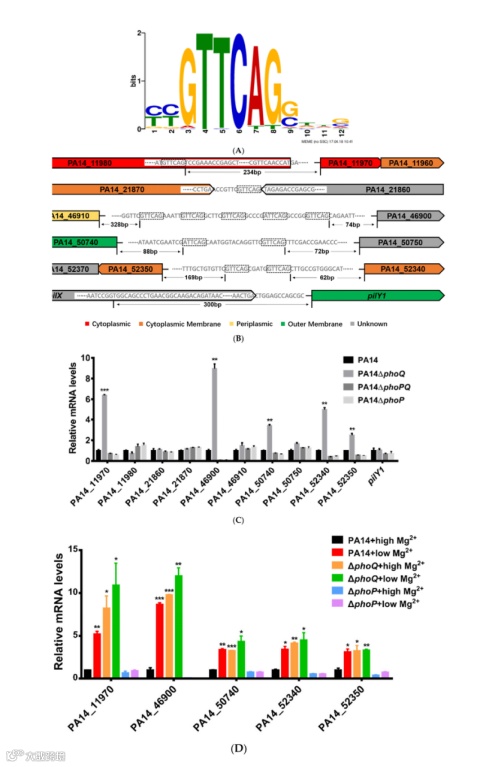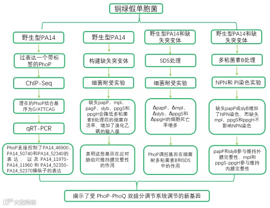 在本研究中,PhoP-PhoQ 双组分调节系统通过直接调节参与 LPS 修饰和膜完整性维持的基因来促进细菌对多粘菌素 B 的耐受性。作者进行ChIP-Seq)并在染色体上发现了新的磷酸化结合位点。进一步研究发现PhoP直接控制了PA14_46900、PA14_50740和PA14_52340的表达,以及PA14_11970-PA14_11960和PA14_52350-PA14_52370的操纵子的表达。结果表明,pagP突变增加了多粘菌素B的结合和敏感性,同时,papP、mpl、slyb、ppgS和ppgH突变降低了多粘菌素B或SDS处理下的细菌存活率,增加了溴化乙砜的输入量,表明这些基因在应对胁迫时维持膜完整性的作用。此外,通过NPN和PI染色试验,作者发现papP和slyB参与维持外膜完整性,mpl和ppgS-ppgH参与维持内膜完整性。研究结果有助于加深我们对铜绿假单胞菌中多粘菌素 B 耐受性决定因素的理解,为后续研究铜绿假单胞菌的耐药性提供理论基础。