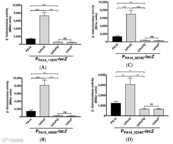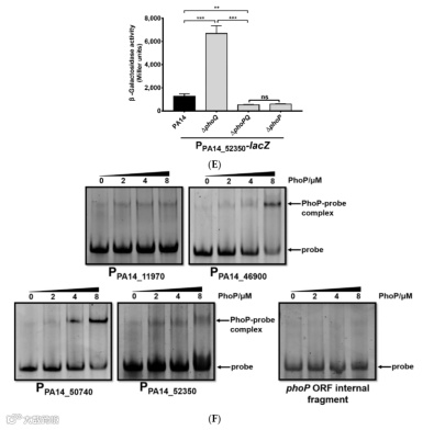 接下来,为了进一步证实这些基因的启动子受PhoP调控,作者在每个启动子与lacZ基因之间构建了转录融合。结果显示,LacZ活性在∆phoP和∆phoP∆phoQ突变体中下降,而在∆phoQ突变体中升高(图2A-E)。此外,纯化的PhoP蛋白可以与PA14_46900的启动子区结合(图2F)。综上,PhoP-PhoQ双组分调控系统基因直接控制了PA14_46900和PA14_50740的表达,以及PA14_52350-PA14_52370和PA14_11970-PA14_11960操纵子的表达。