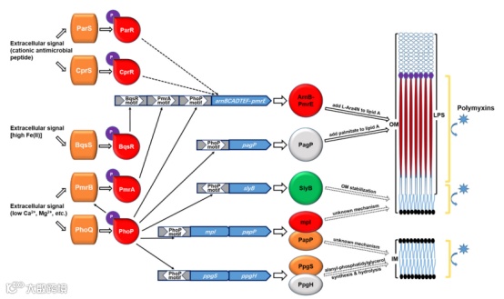图6. 多粘菌素B耐药细菌中PhoP-PhoQ调控基因示意图