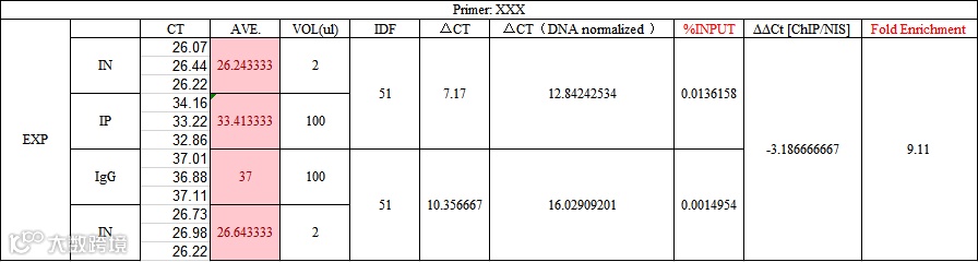 双△CT法也称为2-△△CT法,将PCR的数据转换成CT值(即qPCR反应荧光信号首次到达设定的荧光阈值时所经历的循环数),计算时利用Input做对照(片段化之后直接解交联纯化的DNA,作为材料本身背景)均一化IP产物(△CT),针对阴性抗体富集产物IgG,同样利用Input均一化产物(△CT)。最后计算IP与IgG均一化之后扩增循环数差异(△△CT),并通过2-△△CT计算富集倍数。