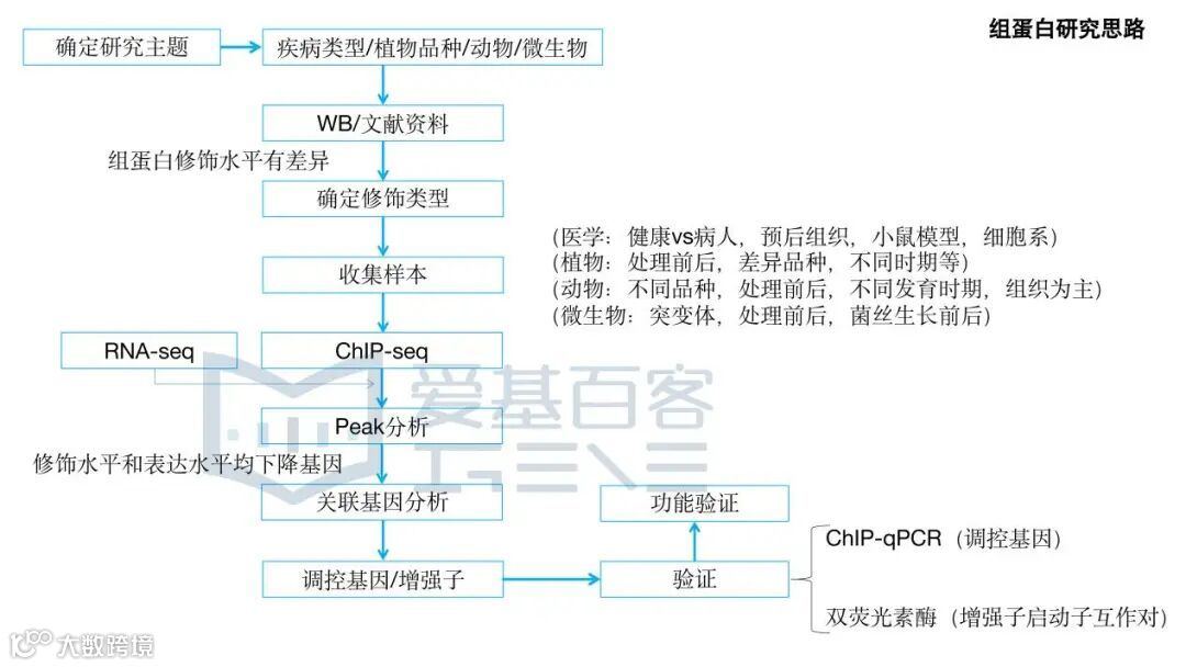 组蛋白修饰的研究思路是先确定修饰类型。通常根据western blotting结果或文献资料,确定研究的物种/组织在组蛋白修饰水平上确实存在差异。