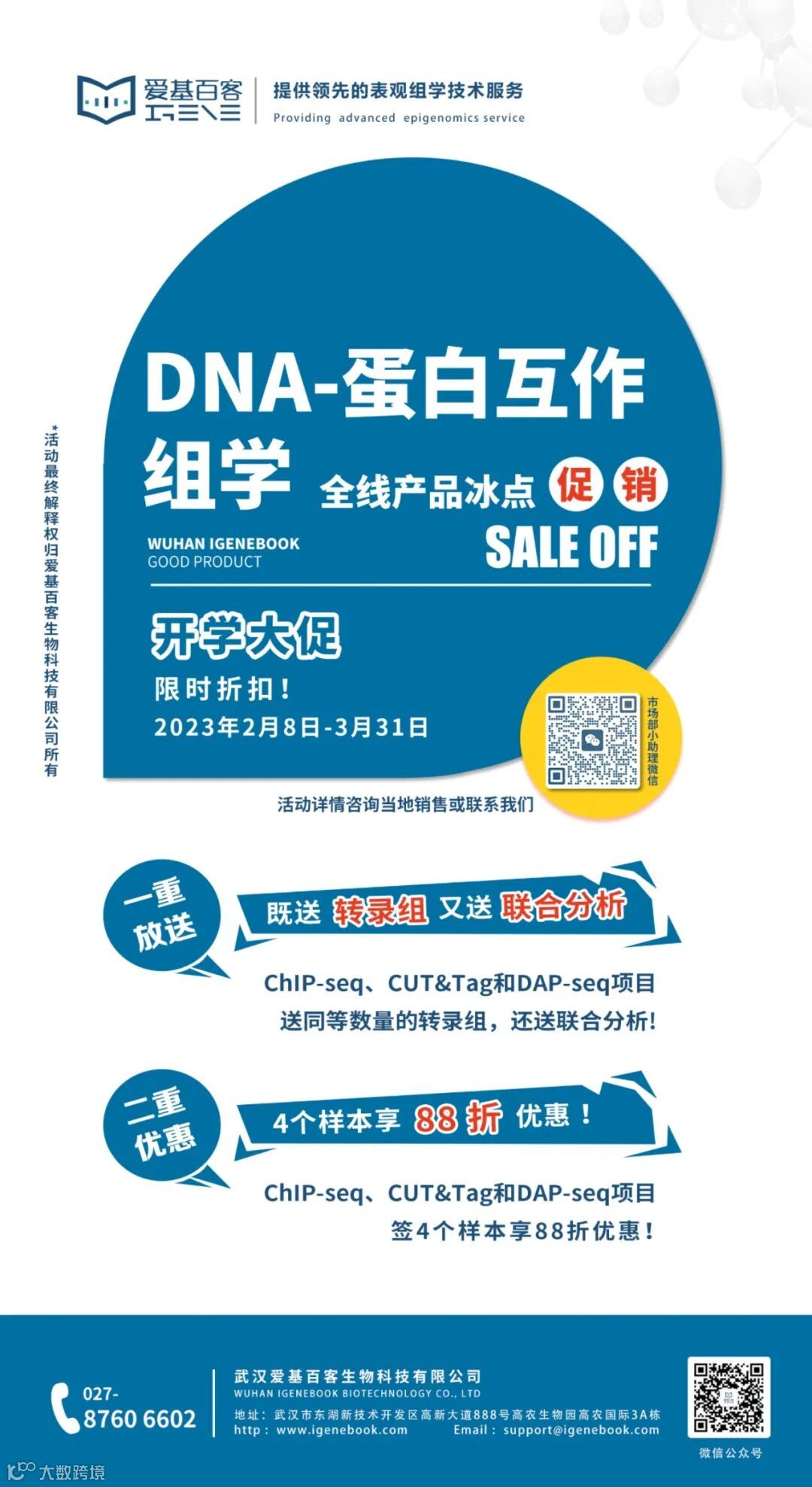 爱基百客专注于表观组学服务领域多年,提供从方案设计、样本制备、测序、生信分析以及后期验证(Western Blot、EMSA、ChIP-qPCR、酵母单杂和双荧光素酶等)一站式服务。ChIP-seq、CUT&Tag和DAP-seq正在做开学大促的活动,不要错过哦~