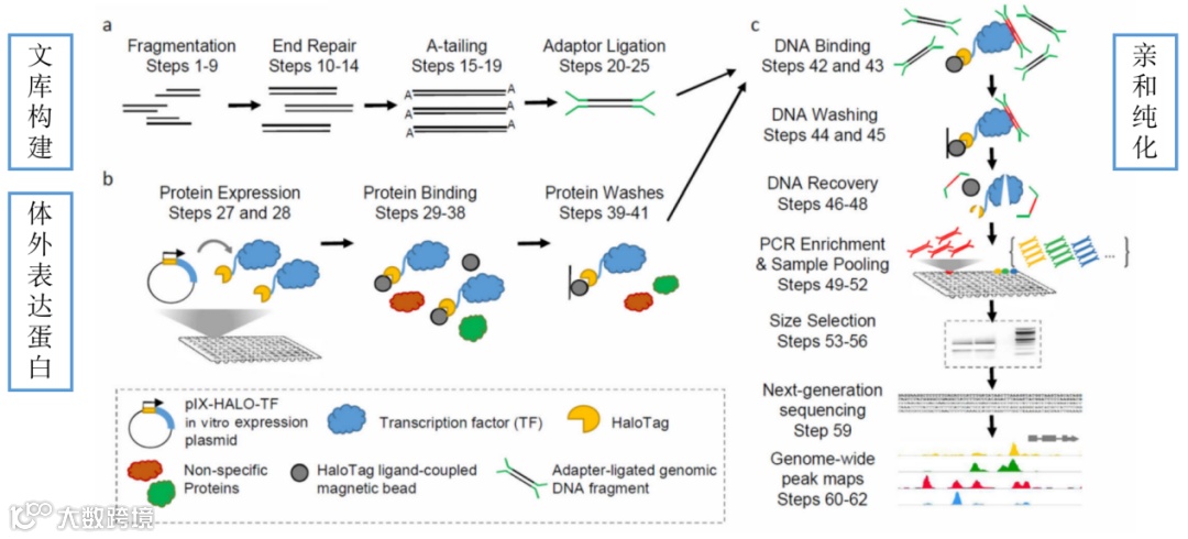 亲和纯化:将纯化的融合蛋白与基因组文库孵育。然后,通过HaloTag特异性磁珠,将目的蛋白和DNA复合物进行提取与纯化,随后捕获的DNA片段进行扩增,测序分析,探究目的蛋白结合的DNA片段。