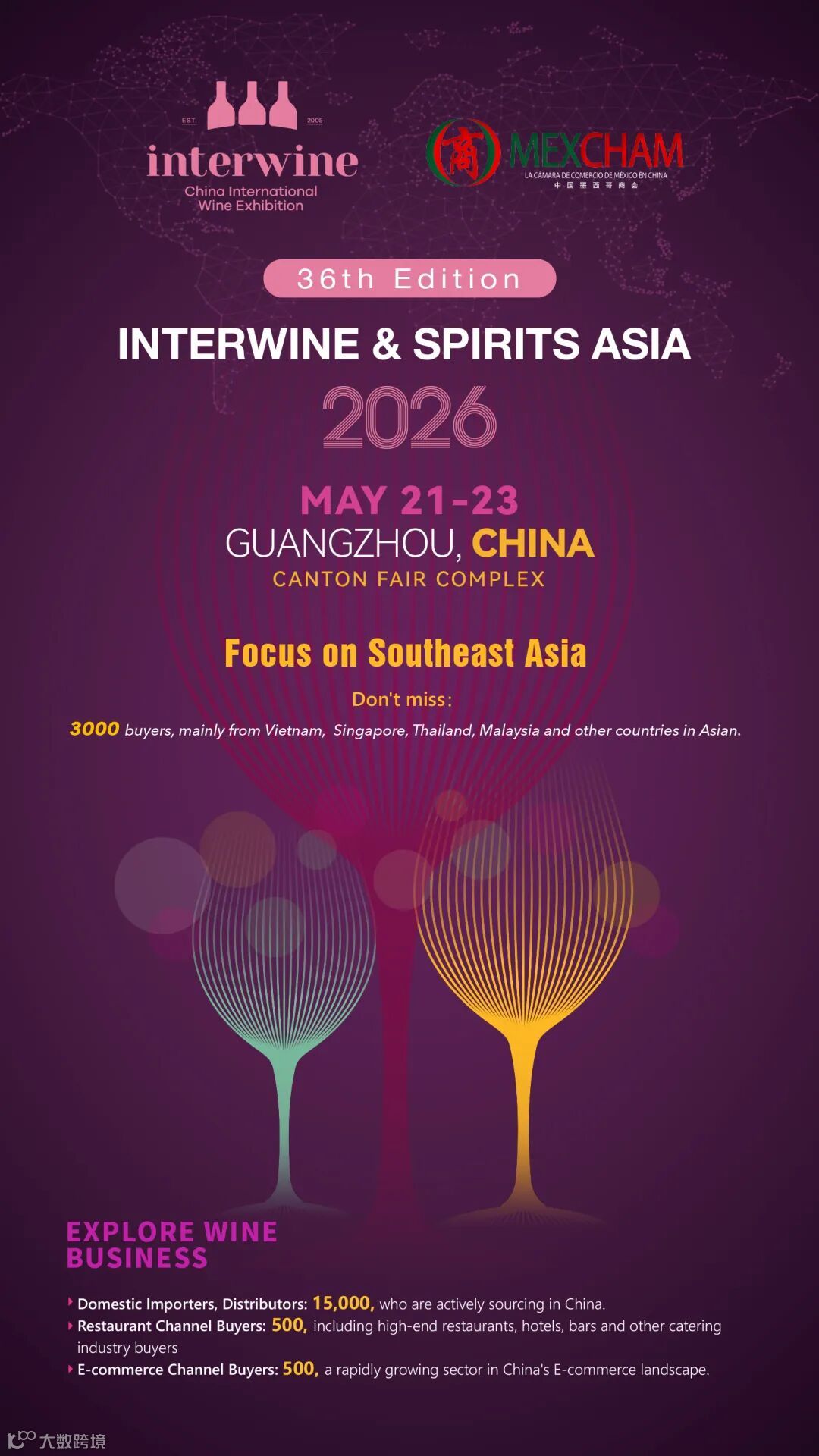 The Mexican Chamber of Commerce in China (MEXCHAM), as a supporting organization, is honored to invite you to the 36th Interwine & Spirits Asia exhibition, to be held in Guangzhou in May 2026.