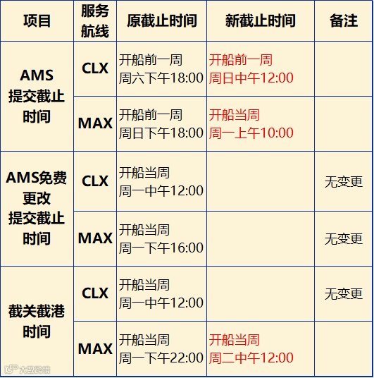 1月14日,美森轮船发布官方公告,宣布对宁波港出口的CLX/MAX航线相关操作时间进行调整,具体为延后该两条航线的AMS(自动舱单系统)提交截止时间及MAX航线截关时间。