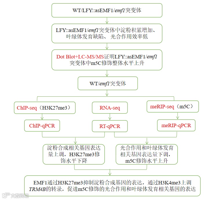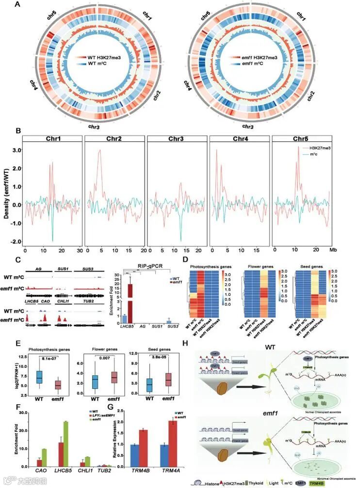 作者发现植物特异性PcG蛋白EMF1具有双重作用,可作为激活剂或阻抑剂。一方面,EMF1通过抑制m5C甲基转移酶TRM4B表达,从而降低m5C 修饰水平,进一步激活光合作用相关基因的转录水平(图 4H)。另一方面,EMF1通过PcG介导的H3K27me3抑制开花、种子和淀粉合成相关基因(图4H)。基因激活和抑制都是营养发育所必需的。本研究结果揭示了一种新的基因表达调控机制,即植物中组蛋白修饰和 RNA m5C甲基化之间的相互作用。