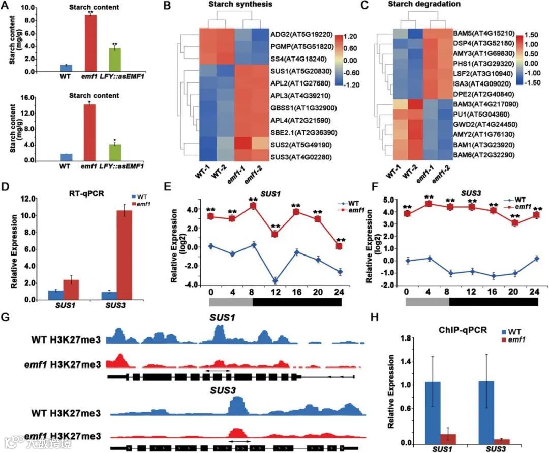 作者发现emf1突变体中淀粉过度积累。为了研究EMF1如何影响淀粉积累,作者分析了淀粉生物合成和降解相关基因的表达量,结果发现大多数淀粉合成基因(73%)在emf1突变体中上调表达(图3B),而淀粉降解基因则均匀上调或下调(图3C)。因此,高度异位表达的淀粉合成基因可能是导致emf1突变体中淀粉积累的原因。据报道,SUS1和SUS3对拟南芥和其他植物物种的淀粉合成很重要。因此,作者选择了这两个基因进行进一步分析。首先通过RT-qPCR验证了SUS1和SUS3在emf1突变体中表达量上调(图3D),随后研究了SUS1和SUS3在WT和emf1植株中24 h的动态表达谱,发现emf1突变体中淀粉的大量积累可能是淀粉合成基因的上调表达引起的。由于EMF1通过H3k27me3参与PcG介导的基因沉默,作者使用先前的ChIP-seq数据分析了WT和emf1突变体中的H3K27me3修饰。结果发现,与WT植物相比,emf1突变体中SUS1和SUS3基因的H3K27me3富集大大降低(图3G),随后通过ChIP-qPCR进一步证实(图3H)。综上所述,这些结果证实了EMF1通过PcG机制维持淀粉生物合成基因的抑制表达状态。