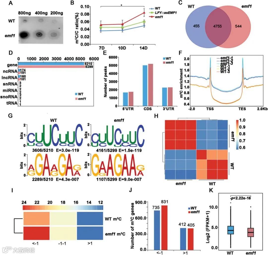 随后,作者对7 DAG的WT和emf1突变体进行meRIP-seq,分别鉴定出5210和5299个存在m5C RNA修饰的基因,其中二者共有的基因为4755个(89.7%)(图2C)。此外,作者发现emf1突变体中m5C甲基化位点的数量与WT相比没有显著增加(图2D,E)。最终,为了确定获得的peak是否具有共同的序列,作者对peak的motif基序进行了分析(图2G),结果显示,WT中最显著的motif基序是YYTCYYCH和RGARGAR(图2G),而emf1突变体中也存在这些motif。综上所述,EMF1不影响大多数m5C富集的基序。