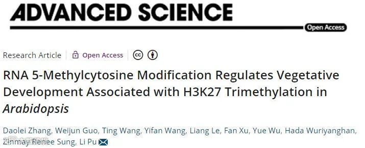 2022年11月16日,中国农业科学院生物技术研究所普莉团队在Advanced Science在线发表了题为“RNA 5-Methylcytosine Modification Regulates Vegetative Development Associated with H3K27 Trimethylation in Arabidopsis” 的研究论文。 该研究作者通过m5C meRIP-seq、RNA-seq、ChIP-seq、LC-MS/MS等技术,发现EMF1通过多种表观遗传修饰来调控基因表达,从而调节拟南芥的营养发育,揭示了一种涉及组蛋白修饰和RNA m5C甲基化的新表观遗传机制,从而为真核生物的基因调控研究提供了新的方向。