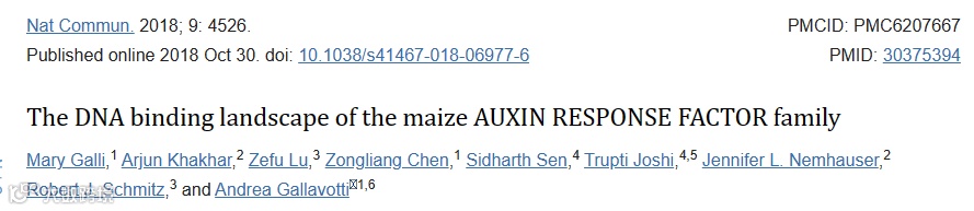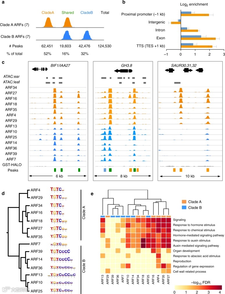 生长素反应因子(ARF)是植物特异性转录因子(TF),它是生长素的感知基因。与许多大型TF家族一样,家族成员是否通过结合不同的靶基因来调节发育特异性成为关键问题。作者对A、B分支(包含14个玉米品种)的ARFs进行了DAP-seq,生成了全基因组体外TF:DNA相互作用图。比较分析显示,同一分支的ARFs具有高度重叠的结合位点,但A和B分支的结合位点有较大差异。然而,来自两个分支的ARF也存在多个共同的结合位点,这表明许多基因协同作用。总体而言,ARF结合的大规模比较分析表明,生长素反应特异性不是由个体ARF结合位点所决定的。