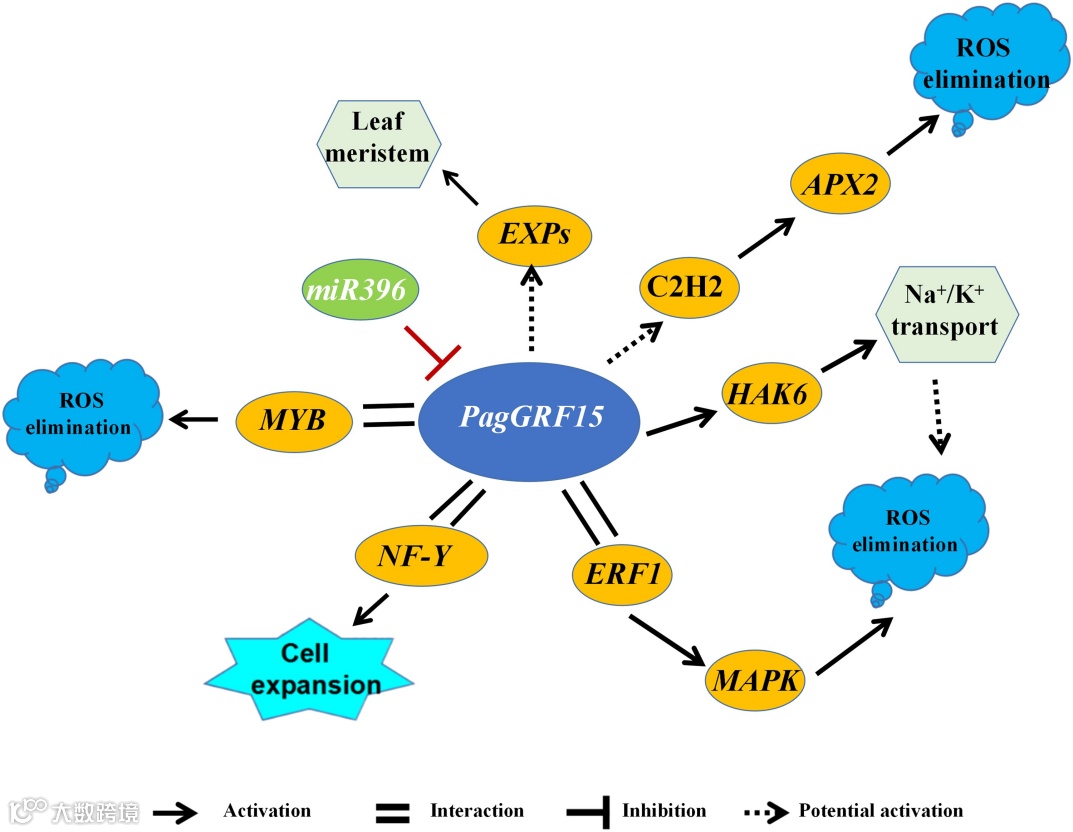 本研究结果结合转录组测序和聚类算法构建了杨树响应盐胁迫的基因调控网络(GRN)。通过DAP-seq和Y2H鉴定了PagGRF15的靶基因和互作蛋白,重构PagGRF15介导的GRN。该结果为后续研究盐胁迫反应相关的调控网络以及GRF如何应对胁迫提供了见解。