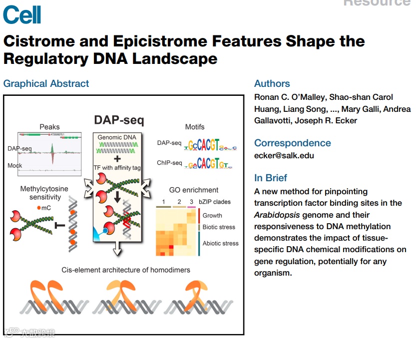 2016年,DAP-seq于Cell期刊首次与大家见面。该技术的出现,使TFBS 的研究不再受物种、抗体质量等因素限制,为不同领域转录因子的研究提供了新的有效工具。