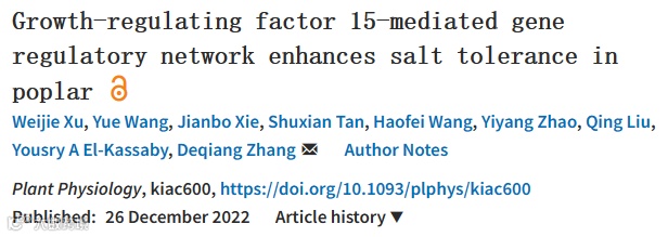 本篇文章围绕杨树中响应盐胁迫基因调控网络展开后续研究。首先通过转录组数据结合相关文献找出了响应盐胁迫的候选TF PagGRF15,随后通过转基因方法验证了该基因的功能。结合Y2H和DAP-seq数据研究了PagGRF15的互作蛋白和靶基因,最终提出了PagGRF15与多基因协同作用以赋予盐胁迫耐受性的假设模型。该研究结果为杨树和其他作物耐盐性的遗传改良提供了候选基因。
