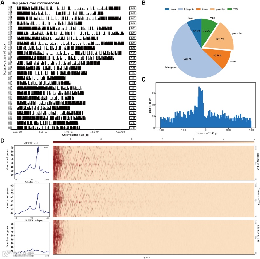 图1 使用DAP-seq鉴定GhBES1.4的靶基因