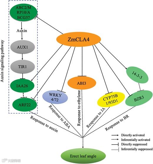 综上所述,研究结果表明ZmCLA4充当了五种主要植物激素信号通路的枢纽,通过直接影响基因转录来负调节玉米叶角。ZmCLA4直接抑制多个生物反应相关的基因,包括生长素,BR,ABA,JA和乙烯信号通路,这为ZmCLA4通过多种信号通路调节LA的作用机制提供了新的见解。
