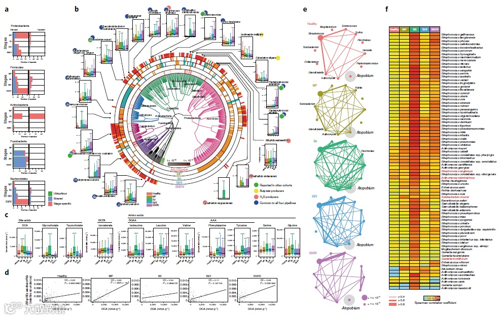 基于宏基因组和代谢组研究平台,对来自大队列CRC中的616名和406名样本分别进行了粪便宏基因组和代谢组学研究,获得不同阶段(MP,S0,Sl /SIl,II/SIV,HS)病例特异性表型的微生物(Atopobiumparvulum和B.wadsworthia等)和代谢(氨基酸和胆汁酸等)标志物;且进一步探索个体直肠癌患者的肠道微生物组与肿瘤与特征之间的关系。