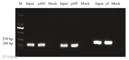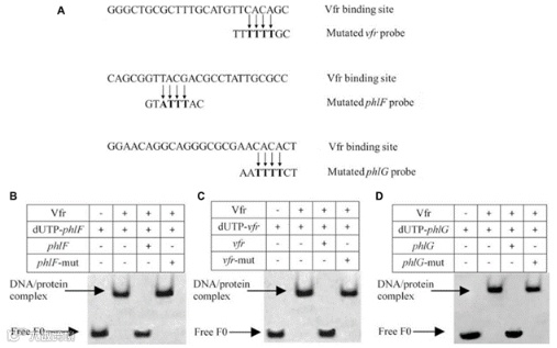 作者通过ChIP-seq分析,在phlF、phlG和vfr附近确定了3个Vfr的潜在目标位点。并设计对应引物进行结果验证。ChIP实验结果表明Vfr在体内分别与phlF、phlG、vfr基因上游区域存在结合 (图2)。