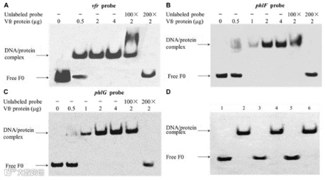 图6 EMSA检测证实了Vfr与vfr、phlF和phlG衍生物探针的结合