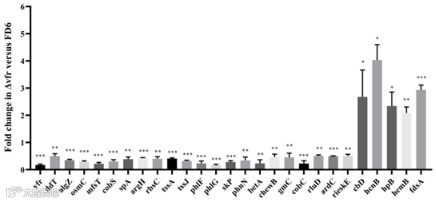 为了确定ChIP-seq所鉴定靶基因的调控是否依赖于Vfr,作者通过qPCR检测了野生型和Vfr突变体中代表性靶基因的表达。结果显示,与野生型相比在△vfr突变株中大部分目的基因表达量明显降低,但存在5个基因表达量增加(图3)。表达下调的基因包括编码VI型分泌系统成分的tssJ和tssA基因以及参与2,4-DAPG生物合成和调控的phlF、phlG基因等。