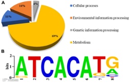 ChIP-seq结果峰显示标注了847个基因,约35.51%和64.49%的结合位点分别位于编码序列和启动子区域为进一步阐明已鉴定的Vfr靶基因的分子功能,通过KEGG通路分析进行鉴定。结果显示Vfr结合基因编码的产物具有不同的功能,包括代谢相关(69%)、环境信息处理(16%)、细胞过程(11%)和遗传信息处理(4%)(图1A)。此外,作者通过HOMER分析进一步确定了长度为5bp的Vfr共识基序,该基序已被鉴定为大肠杆菌和铜绿假单胞菌的保守基序(图1B)。