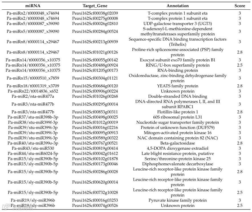 利用miRbase 17.0鉴定到45个保守的miRNAs,包括miR156、miR159、miR160、miR164、miR166/165、 miR167、miR172和miR319 位点。每个发现的miRNA赋予一个ID,格式:Ph-miR(number)。在miRNAs显示与miRBase序列相同的情况下,使用注释Ph-miR (number)/miRBase。最常见的是Pa-miR36/stu-miR395j(12loci)和Pa-miR29/stu-miR166d-3p(8loci),这些miRNAs的前体长度在41-252nt之间。基于茎环结构特征,预测到26个新miRNAs。对发现的miRNA进行表达模式分析,结果暗示miRNA表达表现出随时期或组织而异的特异性,这与红瓜(Coccinia grandis)的性别特异性miRNA在性别分化的激活起重要作用以及拟南芥花同位异型转录因子和miRNA调控花发育的动态调控网络中类似。