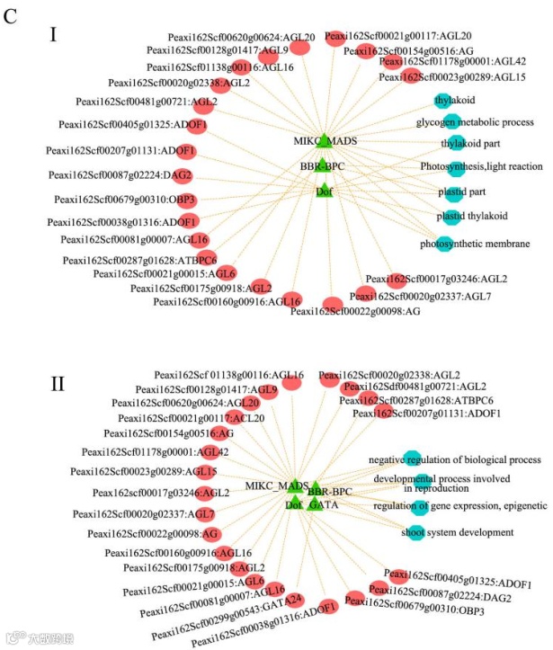 根据WGCNA结果,作者选择蓝色和yel+tur(黄色和绿松石色的基因表达模式基本相似,作者将这两个模块的基因作为一个样本)模块中的基因构建一个假定转录调控网络,将启动子区含有结合motif的共表达基因与具有结合位点的转录因子基因连接起来。如图3C(I)所示,蓝色模块显示MIKC-MADS、BBR-BPC和Dof的DNA序列基序高度富集,主要与AGL2、AGL16、AG、AGL9、ATBPC6、ADOF1、DAG2和OBP3等转录因子相关。靶基因在类囊体、糖原代谢过程、类囊体部分、光合作用、光反应、质体部分、质体类囊体和光合膜等方面富集GO。MIKC_MADS、BBR-BPC、Dof和GATA的DNA基序在图3C(II)的yel+tur模块中发现,TFs包括AGL9、AGL20、AGL16、ATBPC6、ADOF1、OBP3和GATA24。该模块的靶基因涉及GO项的生物过程负调控、生殖发育过程、基因表达调控、表观遗传和茎系统发育。