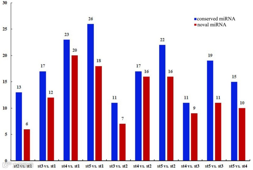 图4 两个不同发育阶段差异表达miRNAs的数量