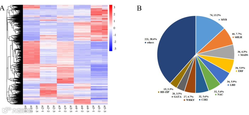 转录因子基因在花的发育过程中起着至关重要的作用,并且许多属于不同转录因子家族的成员已经被证实在花形成的各个方面都很活跃。FDR<0.05以及|logFC|>2为标准筛选,共有575个DEGs编码转录因子,并且根据转录因子数据库将它们划分到39个TF家族。占比最多的前10 TF家族在图2B中展示,MYB基因家族占比最多(76;13.2%),其次是bHLH、MADs、ERF和LBD。TF家族中表达差异最大的TF基因都出现在st5和st1中,对应于形态差异最大的时间段。