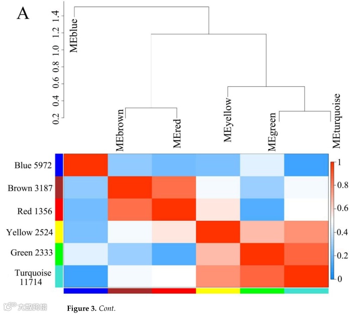 根据基因在不同发育阶段的表达模式,将具有相似转录组谱的基因聚类。共鉴定到9个不同的表达集群,通过WGCNA分析进一步分为6个模块:蓝色、棕色、绿色、红色、绿松石色和黄色模块(图3A)。在每个模块中,基因在表达模式上具有较高的协同性。作者对每个模块的共表达基因的表达模式进行分析,还对基因进行GO和KEGG功能分析(图3B)。