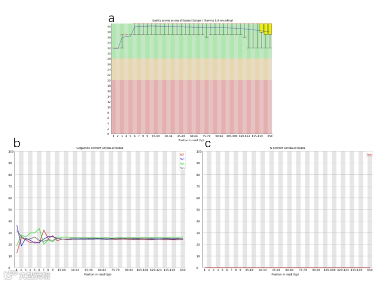 在Clean Data质量分析中我们通常会看到Q20和Q30这两个概念(类似于产品合格率),它们分别代表碱基错误识别率为1% 和0.1%。我们通常选择Q30作为碱基质量评价标准,Q30的值越大越好,一般大于85%结果会比较好,对应到图3a整体碱基质量分数在绿色区域(>28)是比较好的结果。碱基含量即ATGC四种碱基所占的比例,一般除了前一小段碱基位置之外(大概10bp左右,这是二代测序的通病),4种碱基的含量线条应呈现出平行且接近的状态(图3b)。此外,在测序过程中识别不了的碱基(N碱基)的含量越少越好,一般接近于0(图3c)。