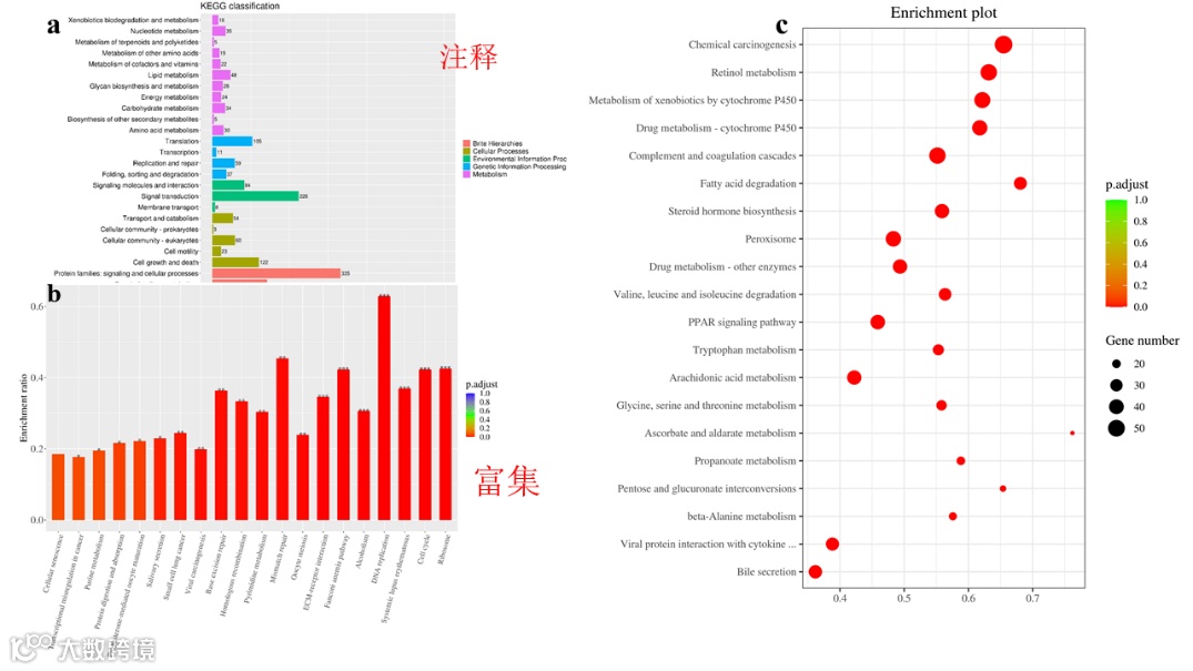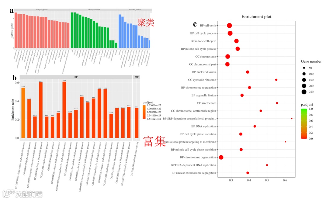 将GO注释对应的gene数目,进行统计然后按照分子功能 (Molecular Function)、细胞组分 (Cellular Component) 和生物学过程 (Biological Process) 分类绘图,结果如图9a所示,基因可以通过ID对应或者序列注释的方法找到与之对应的GO号,而GO号可对应到具体的term,即功能类别或者细胞定位,这也是GO富集的一个基础。而富集的目的就是从差异显著的基因中挑选出我们需要的基因,并分析挑选结果是否可信。GO 富集柱状图和富集气泡图(图9b、c),它们都是GO 富集结果直观展示。气泡图气泡的大小代表基因的数目,颜色代表P值,P值越小基因数目越多代表我们得到的结果越可信。总之,通过差异基因的GO 分析,可以找到富集差异基因的GO分类条目,从而寻找不同样品的差异基因可能与哪些基因功能的改变有关。