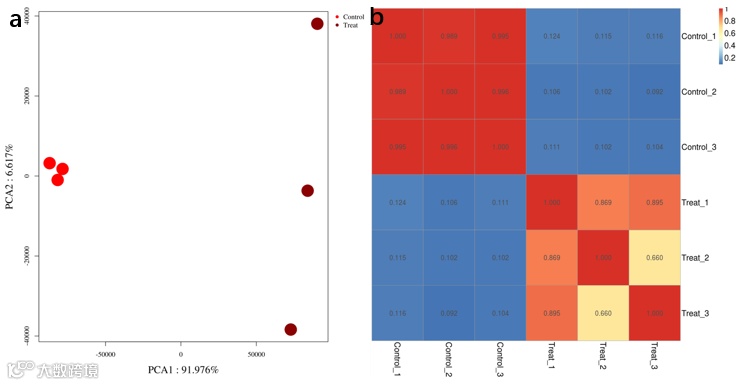 生物学重复之间的相关性高低与差异基因鉴定的准确性息息相关,我们通常采用两种算法进行重复性的评估(图6)。主成分分析(PCA)是设法将原来众多具有一定相关性的指标(如reads 的分布特征),重新组合成一组新的互相无关的综合指标,从而降低问题的复杂性,来研究样品间的主成分关系。二维PCA图将主成分 1(PC1)和主成分 2(PC2)分别作为 X 轴和 Y轴的散点图,图内每个点代表 1 个样本。如果两个样本距离越远,则说明两个样本 reads分布的差异越大。反之,则说明相应样本 reads 整体分布模式越接近。理想情况下,生物学重复的样本应该聚类在一起,而处理组间应该可以清晰区分开(图6a)。除PCA外, pearson相关性分析热图也是用于衡量生物学重复的方法,热图中会展示相关性具体数值,并用不同的颜色进行标注,相关性越高颜色越深。正常情况下,组内重复的相关性最好是大于不同组之间的相关性。