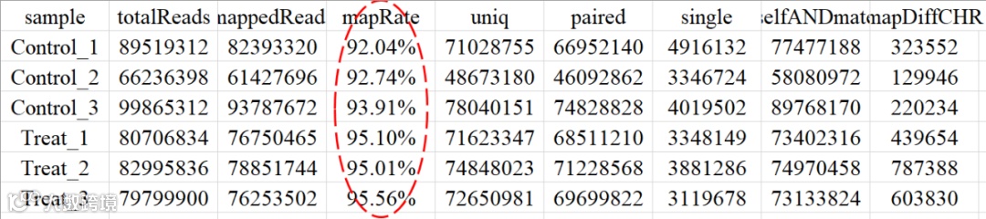 在这一部分,我们首先来看基因组比对分析,就是将 Clean reads 数据使用 hisat2 软件 (version: 2.0.1-beta) 比对到参考基因组,比对结果会出现如图4所示,在表中我们需要关注mapRate,除了样本污染的非常规因素,比对率主要与参考基因组与目标物种的适配度有关,参考基因组的选择也是转录组分析比较重要的影响因素(详情可参考爱基百客公众号《如何填写测序项目信息分析表》)。