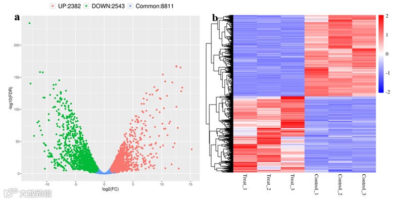 最后,来到我们转录组测序结果最核心的部分,差异基因的鉴定与功能富集分析。首先,为了比较不同样本间的基因表达量差异,我们通过R包edgeR进行差异表达分析,筛选阈值设定为FDR < 0.05&| FoldChange | > 2 ,结果如上表2.5所示,FDR为错误发现率,一定程度上对p值的假阳性进行了校正,而FoldChange则表示差异倍数,在文章或结果中常见以log2FC进行展示。差异基因的可视化一般以火山图进行展示(图8a),绿色代表下调基因,红色代表上调基因,对FDR取了负log,负log就越大,两个基因之间的差异也越显著,所以在火山图里,越外层的岩浆差异越大,火山图可以更加形象的展示出整体表达差异信息。图8b 代表差异基因heatmap图,这张图中的红色和蓝色分别代表基因的上调和下调,颜色的深浅代表基因的上下调程度,通过差异基因heatmap图我们可以得到不同处理样品之间基因表达的差异。
