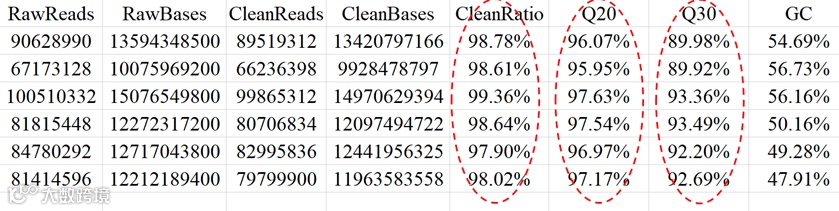 原始数据通常需要过滤得到Clean Data,Clean Data的数据评估中主要包括碱基质量、碱基分布以及碱基含量。图2是数据统计表,其中Raw reads和Clean reads分别代表原始测序 reads 数和过滤得到的 reads 数,Raw Bases 和Clean reads分别代表原始数据的总碱基数和过滤后的总碱基,CleanRatio则代表 clean reads 所占比例,理论上越高越好。