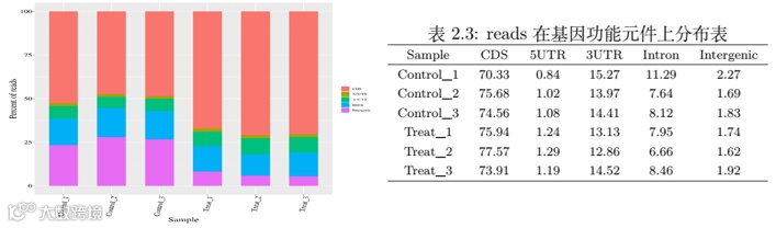 同时我们将比对到基因组上的有效 reads 按照功能元件进行统计,把基因组分为CDS、 5UTR、 3UTR、 Intron 和 Intergenic 区域分别统计落在其上的 reads 比例。正常情况下, RNA-seq 的reads 大部分会落在 CDS 区域,统计结果如图7。