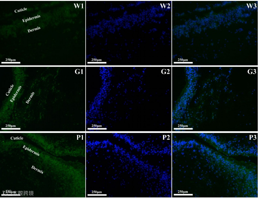 采用原位杂交法观察MITF mRNA的空间表达情况。研究发现MITF在白、绿、紫刺参中的表达位置没有差异,主要表达于表皮。