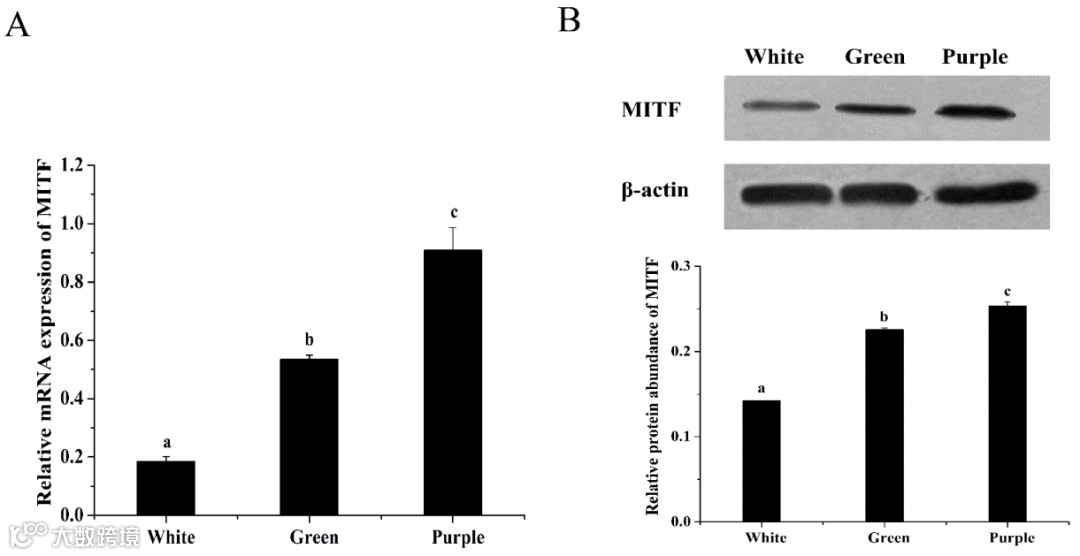 该研究利用qPCR和Western blot检测MITF在三色形态刺参中mRNA和蛋白的表达水平。mRNA与蛋白表达的相关性检验显示两者存在显著相关(P<0.01)。紫色刺参的mRNA和蛋白相对表达水平都是最高的,白色刺参是最低的。
