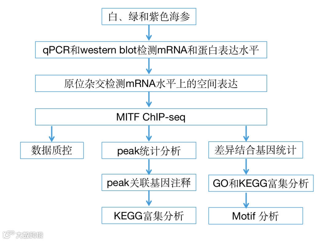 研究评估了MITF在不同颜色形态中的表达水平和分布,并使用ChIP-seq方法分析了MITF在绿色、白色和紫色刺参中调控的基因。ChIP-seq鉴定的结合位点提高了我们对刺参中关键motif和调控关系的理解。研究结果也为基因功能和体色形成和分化的机制提供了见解。