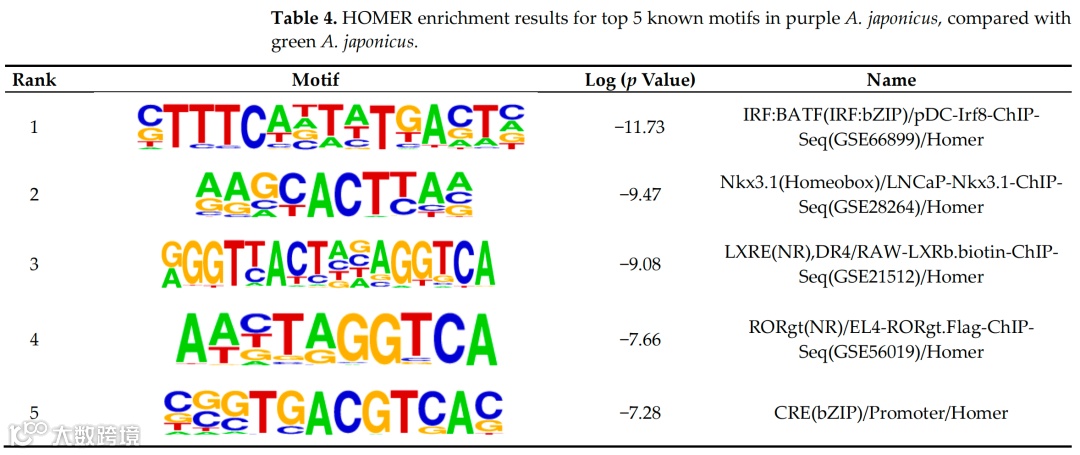 该研究中利用HOMER软件进行motif分析,首先是重头预测(de novo)motif。与绿色刺参相比,紫色刺参中有18个MITF特异结合峰的de novo motif 富集。当每个峰对应的DNA序列与已有的TF结合位点motif进行比较用于获得所有可能的TF结合位点时,发现有11个motif富集。与绿色刺参比较,在白色刺参的MITF特异结合峰有20个de novo motif和22个已知motif富集。